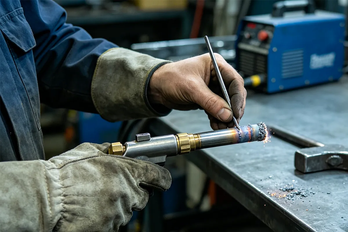 The correct approach is mechanical removal with a purpose-built spatter cleaning tool — typically a flat scraper or a reamer designed for the nozzle bore diameter. Some welders use a wire brush. Both work. The goal is controlled removal without applying impact force to the torch body.