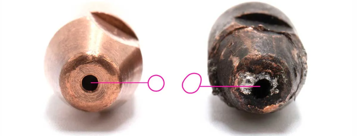- На внешней стороне наконечника видны оплавления, овалы или наросты.